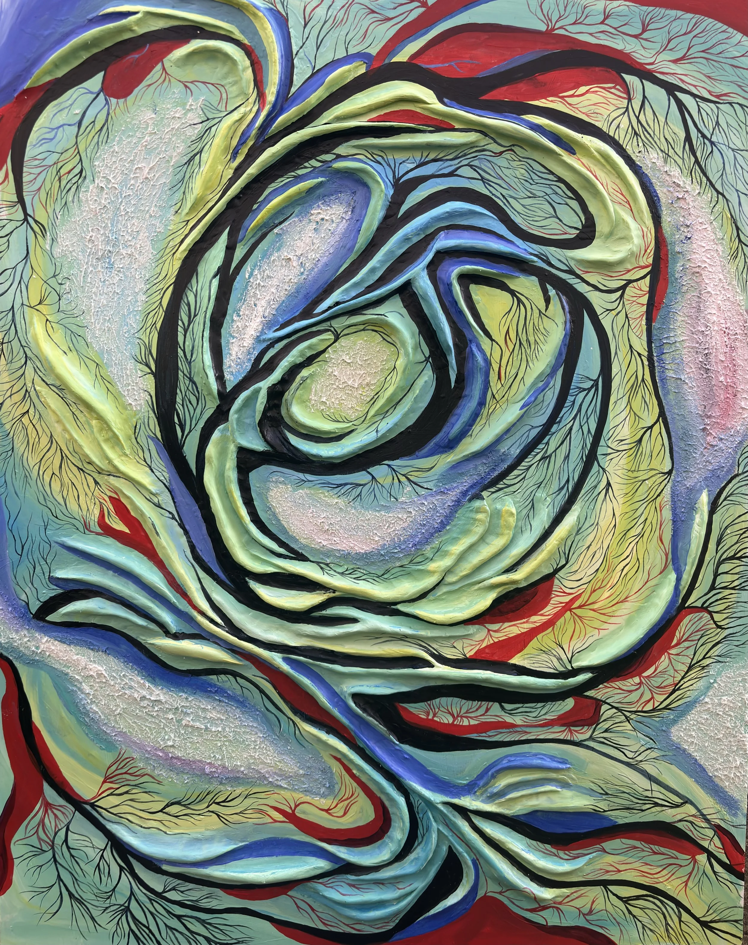 The use of vibrant color and textured surfaces creates a tactile experience, encouraging a deeper understanding of the body as an extension of nature. Each piece serves as a visual conversation, urging us to consider the relationships between ourselves and the world around us, and how one influences the other. My work aims to highlight the fragile yet enduring bonds that tie us to the earth, drawing parallels between the paths of nerves and the winding branches that connect us all.